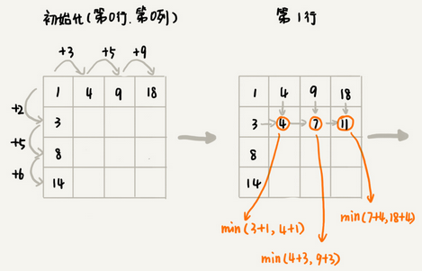 我们画一个二维状态表,表中数值表示从起点到这个位置的最短路径,按照决策过程,不断状态递推演进,将表填好。弄懂了填表过程,代码实现那就简单了。