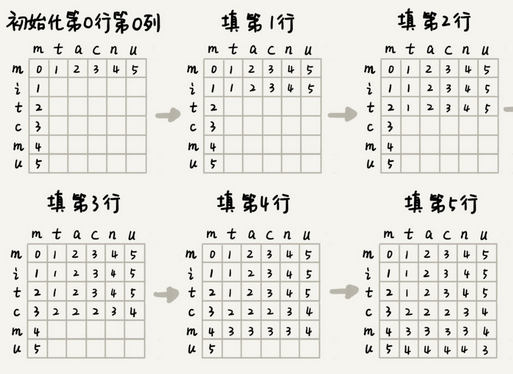 如果:a[i] != b[j],那么: min_edist(i, j) = min( min_edist(i-1, j)+1, min_edist(i, j-1)+1, min_edist(i-1, j-1)+1 ) 如果:a[i] == b[j],那么: min_edist(i, j) = min( min_edist(i-1, j)+1, min_edist(i, j-1)+1, min_edist(i-1, j-1) )