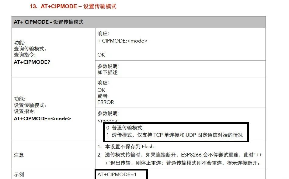 发送指令“AT+CIPMODE=1”设置成功则返回OK。