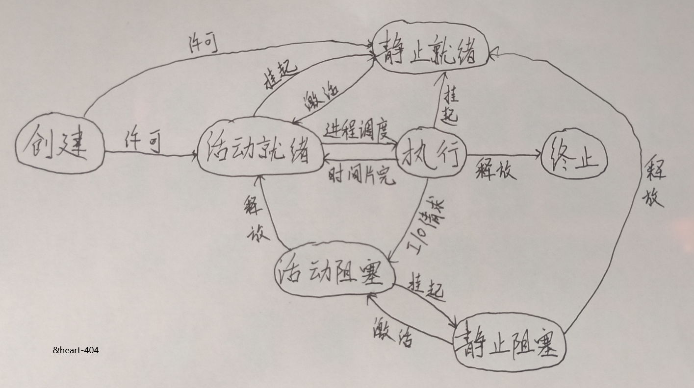 1.画出有挂起操作的操作系统中进程状态转换图,标出引起进程状态变化的主要原因。