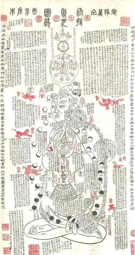 修真图的主架,乃一身有关修真的透视图,图的右上角有整体之简述,人身关窍穴位数百,修真图显示了重要关窍的名称与不同的别称及其在人体相对的位置,此可澄清流误,防止盲修瞎炼。譬如,道祖之十四字真言:『玉炉烧炼延年,正道行修益寿丹』,当中所指之 “玉炉” ,究竟在那里?欲明所指,只须图中寻。更多内容,请关注龙虎山道家养生公众号!