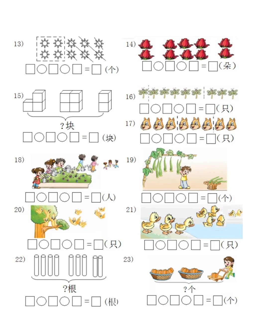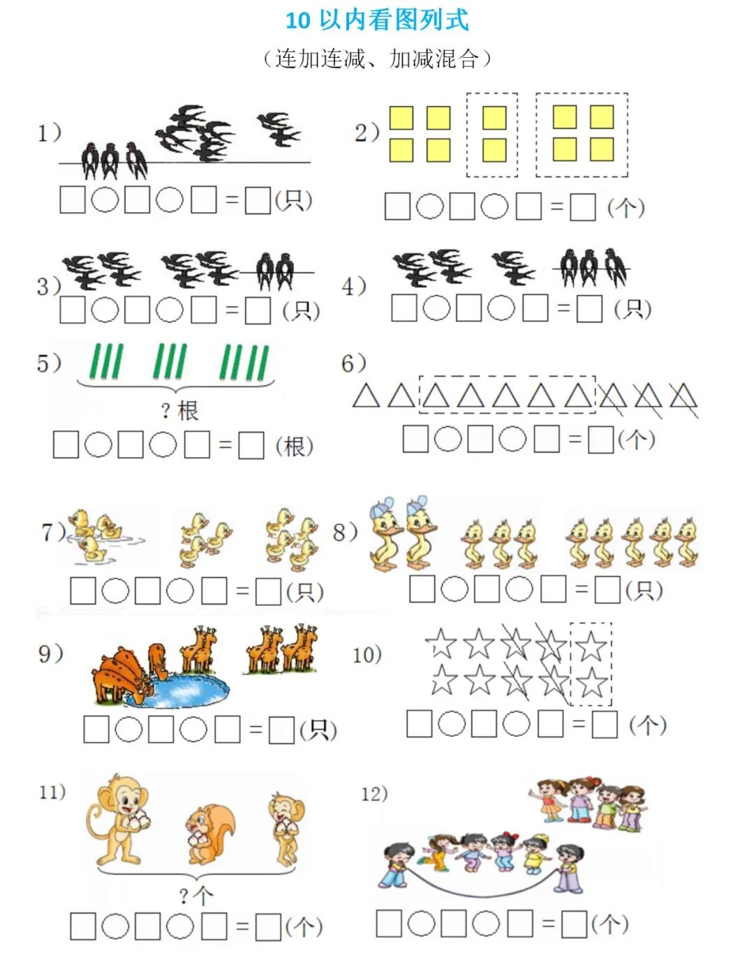 王老师整理了小学一年级上册数学10以内看图列式连加连减、加减混合练习,打印做一做!