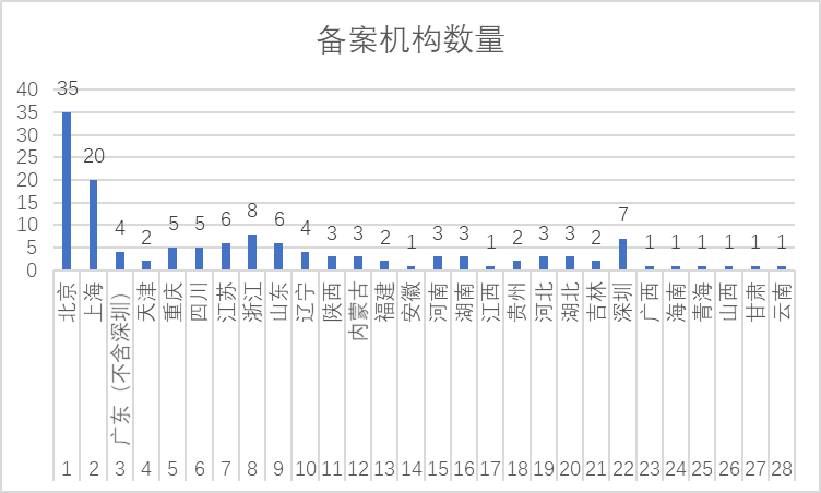 从上图和表中看出,备案机构主要集中在经济发达地区,如北京、上海、广东(含深圳)、浙江、江苏、山东、重庆等省市,约占70%,而其他大部分省市为1-4家机构,同时,尚有西藏、黑龙江、新疆、宁夏等4省区无一家备案机构。
