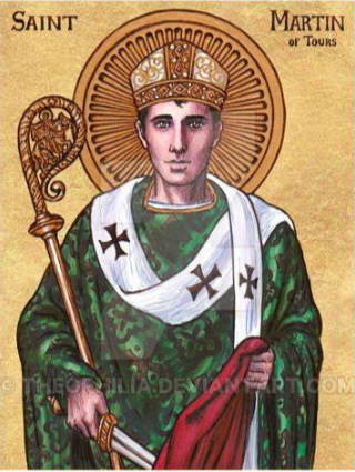马丁是四世纪时生活在法兰西的都尔市(Tours)里的一位基督教僧侣。他原本是一名罗马士兵,后来受洗成为了一名虔诚的基督教徒。他为人友善,生活俭朴。据说他有次在途中遭遇暴风雪,见到路边有一位饥寒交迫的乞丐,他毫不犹豫地将自己的斗篷撕成两半,将其一半盖在这位乞丐身上,使他免于死于饥寒。