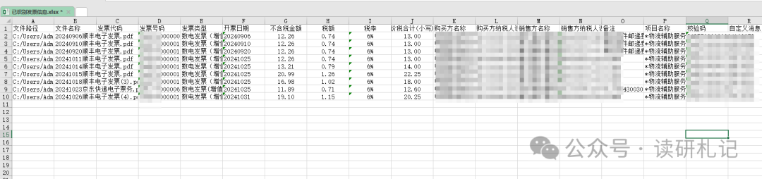 文件路径、文件名称、发票代码、发票号码、发票类型、开票日期、不含税金额、税额、税率、价税合计(小写)、购买方名称、购买方纳税人识别号、销售方名称、销售方纳税人识别号、备注、项目名称、校验码、自定义消息