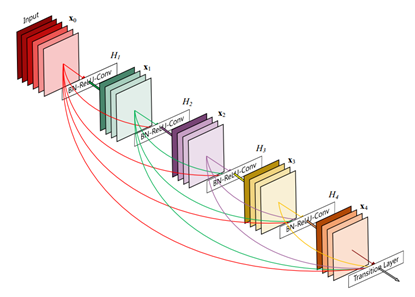 如果真的每层的输出都稠密地连接到后面的所有层,那么模型将变得非常“宽”,计算将会很慢。因此,作者采用的是“局部”稠密连接,如下图所示,每个block里面才进行稠密连接。每个block里面的连接方式如下图所示,前面层的输出通过shortcut直接连接到block中后面的其他层。block之间通过transition层连接。