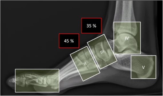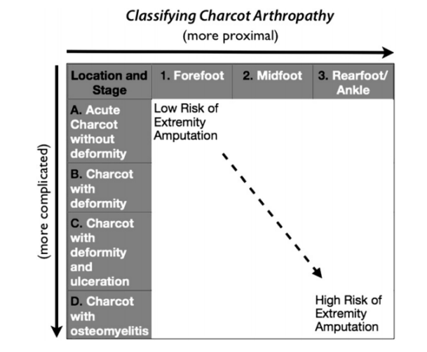 Sanders-Frykberg分区。I区:跖趾关节和指间关节,II区:跗跖关节,III区:Chapart关节,IV区:踝关节和距下关节,V区:跟骨