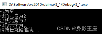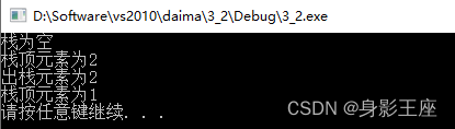 讯享网int main() { SqStack *S1; ElemType e,e1,e2; InitStack(S1); if(StackEmpty(S1)) { printf("栈为空\n"); } Push(S1,1); Push(S1,2); GetTop(S1,e); printf("栈顶元素为%d\n",e); Pop(S1,e1); printf("出栈元素为%d\n",e1); GetTop(S1,e2); printf("栈顶元素为%d\n",e2); DestroyStack(S1); system("pause"); return 0; }