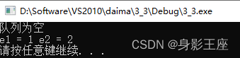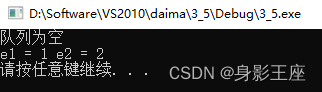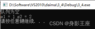 讯享网int main() { SqQueue *S; ElemType e1,e2; InitQueue(S); if(QueueEmpty(S)) { printf("队列为空\n"); } else { printf("队列不为空\n"); } enQueue(S,1); enQueue(S,2); deQueue(S,e1); deQueue(S,e2); printf("e1 = %d e2 = %d\n",e1,e2); system("pause"); return 0; }
