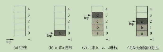 - 元素e的进栈操作:先将栈顶指针top增1,然后将元素e放在栈顶指针处。