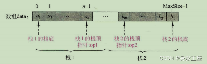 - 出栈x操什:出栈1操作为 x= data[ top1];top1--;出栈2操作为 x= data[top2];top2--。