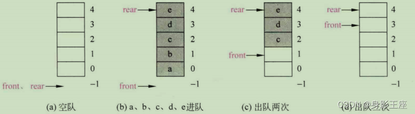 - 元素e的进队操作:先将rear+1,然后将元素e放到data数组的rear位置。