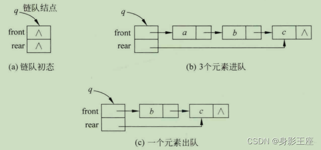- 出队操作:取出队首节点的data值并将其删除。