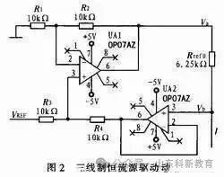 由于温度对集成运放参数影响不如对晶体管或场效应管参数影响显著,由集成运放构成的恒流源具有稳定性更好、恒流性能更高的优点。尤其在负载一端需要接地的场合,获得了广泛应用。所以采用图2所示的双运放恒流源。其中放大器UA1构成加法器,UA2构成跟随器,UA1、UA2均选用低噪声、低失调、高开环增益双极性运算放大器OP07。