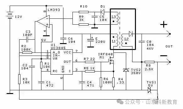 研制仪器需要一个能在0到3兆欧姆电阻上产生1MA电流的恒流源,用UC3845结合12V蓄电池设计了一个,变压器采用彩色电视机高压包,其中L1用漆包线在原高压包磁心上绕24匝,L3借助原来高压包的一个线圈,L2借助高压包的高压部分。L3和LM393构成限压电路,限制输出电压过高,调节R10 可以调节开路输出电压。
