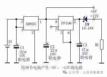 两节1.5V碱性电池输出的3V电压输入AH805,AH805输出+5V电压,其一路作5V输出,另一路输入FP106使其产生28~30V电压,经稳压管稳压后输出+12V电压。