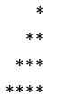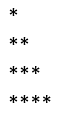 public static void main(String[] args) { for (int i = 1; i <= 4; i++) { for (int j = 1; j <= i; j++) { System.out.print("*"); } System.out.println(); } }