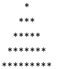 public static void main(String[] args) { for (int i = 1; i <= 5; i++) { for (int j = 1; j <= 5 - i; j++) { System.out.print(" "); } for (int j = 1; j <= 2 * i - 1; j++) { System.out.print("*"); } System.out.println(); } }