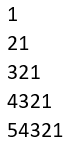讯享网 public static void main(String[] args) { for (int i = 1; i <= 5; i++) { for (int j = i; j >= 1; j--) { System.out.print(j); } System.out.println(); } }