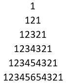 public static void main(String[] args) { for (int i = 1; i <= 6; i++) { for (int j = 0; j < 6 - i; j++) { System.out.print(" "); } for (int j = 1; j <= i; j++) { System.out.print(j); } for (int j = i - 1; j > 0; j--) { System.out.print(j); } System.out.println(); } }
