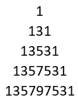 讯享网 public static void main(String[] args) { for (int i = 1; i <= 5; i++) { for (int j = 0; j < 5 - i; j++) { System.out.print(" "); } for (int j = 1; j < 2 * i - 1; j += 2) { System.out.print(j); } for (int j = 2 * i - 1; j >= 1; j -= 2) { System.out.print(j); } System.out.println(); } }