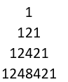 public static void main(String[] args) { for (int i = 1; i <= 4; i++) { for (int j = 0; j < 4 - i; j++) { System.out.print(" "); } int k = 1;//被打印的那个数 for (int j = 1; j <= i; j++) { System.out.print(k); k *= 2; } k /= 2;//因为上一个循环里面多乘了一个2 for (int j = 1; j < i; j++) {//或者while(k>1) k /= 2; System.out.print(k); } System.out.println(); } }