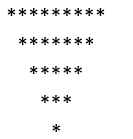 讯享网 public static void main(String[] args) { for (int i = 5; i > 0; i--) { for (int j = 0; j < 5 - i; j++) { System.out.print(" "); } for (int j = 0; j < 2 * i - 1; j++) { System.out.print("*"); } System.out.println(); } }