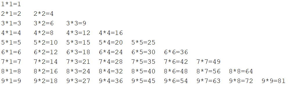 public static void main(String[] args) { for (int i = 1; i <= 9; i++) { for (int j = 1; j <= i; j++) { System.out.print(i + "*" + j + "=" + i * j + "\t"); } System.out.println(); } }