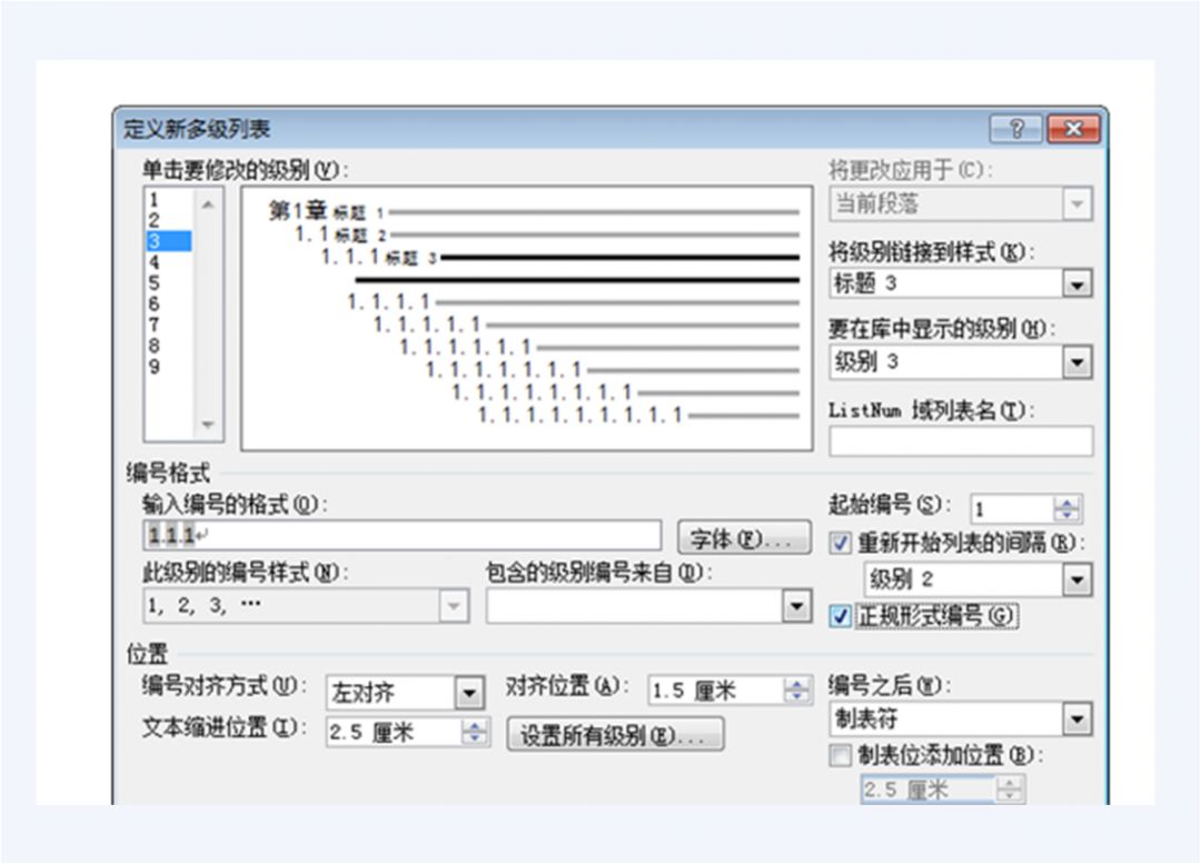 编号样式:点击“此级别的编号样式”,可以将节标题的编号格式由缺省的阿拉伯数字(1,2,3…)更改为其它形式,如中文大写(一、二、三…)、罗马数字(I,II,III,…)等,读者可以点开看看具体有多少选项。这里,我们只考虑阿拉伯数字格式。