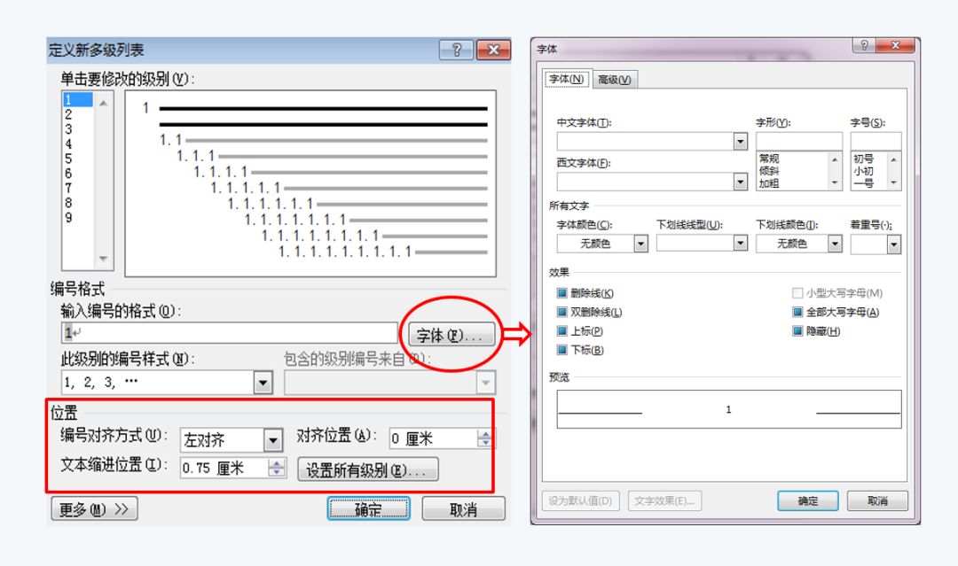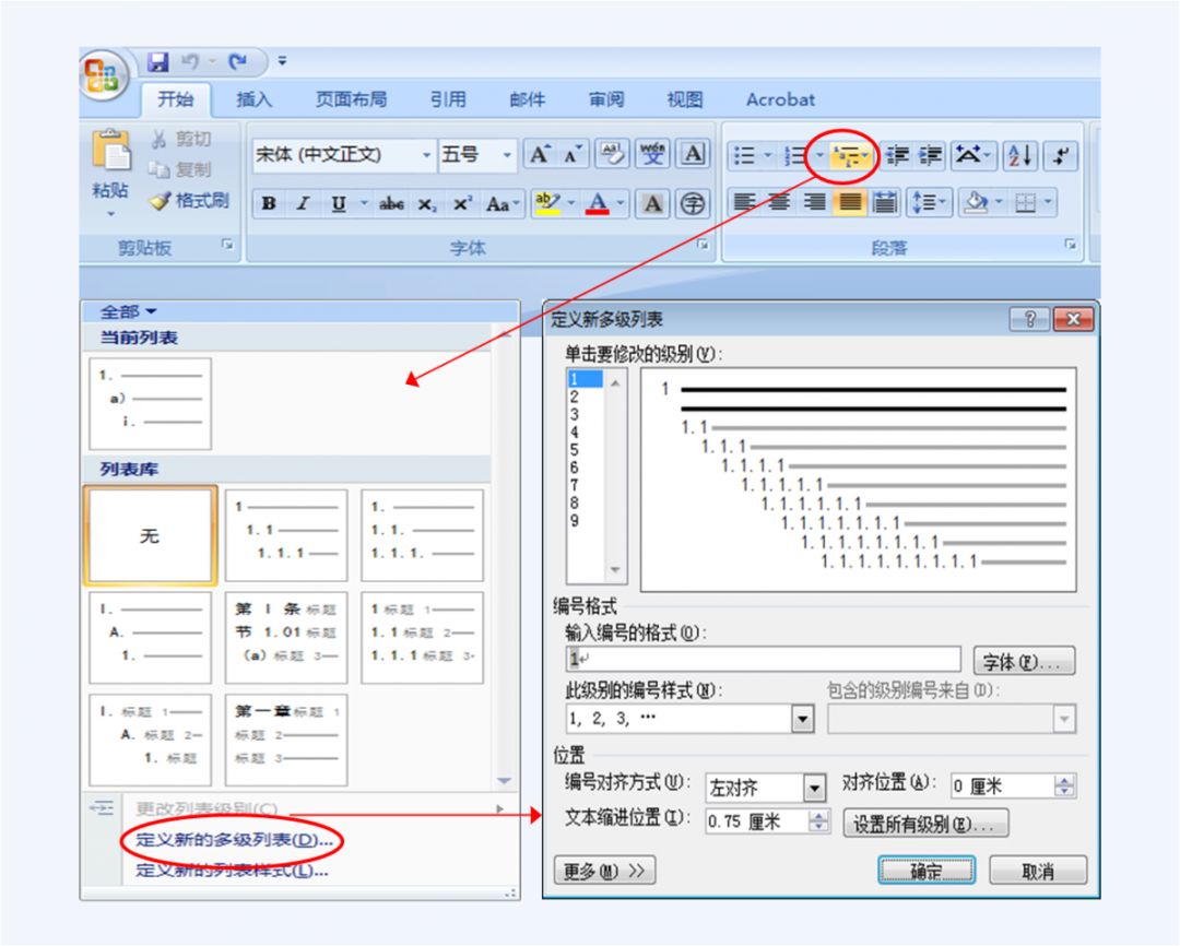 点击“多级列表”按钮,将弹出如图5左下角所示的多级列表对话框。可以看到左下红圈标注位置的“定义新的多级列表”按钮。点击该按钮,将弹出如图5右下角所示的“定义多级列表”对话框。