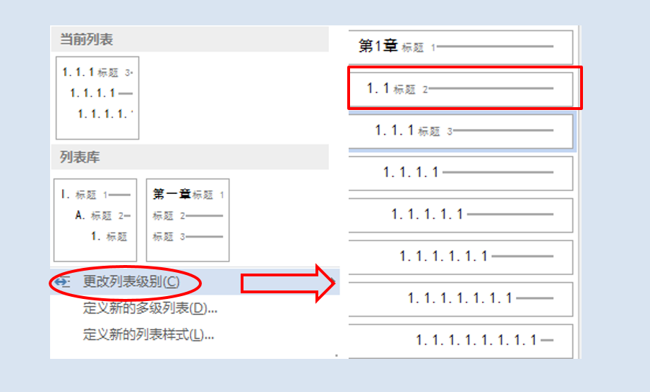 我们发现,如果出现这种情况,那么先把某字段设为三级标题,将光标置于该位置,再打开多级列表,选择”更改列表级别”,如图15所示,点击图中红框标注的“1.1 标题 2”,此时,在样式库中,就会出现“1.1—标题2”。