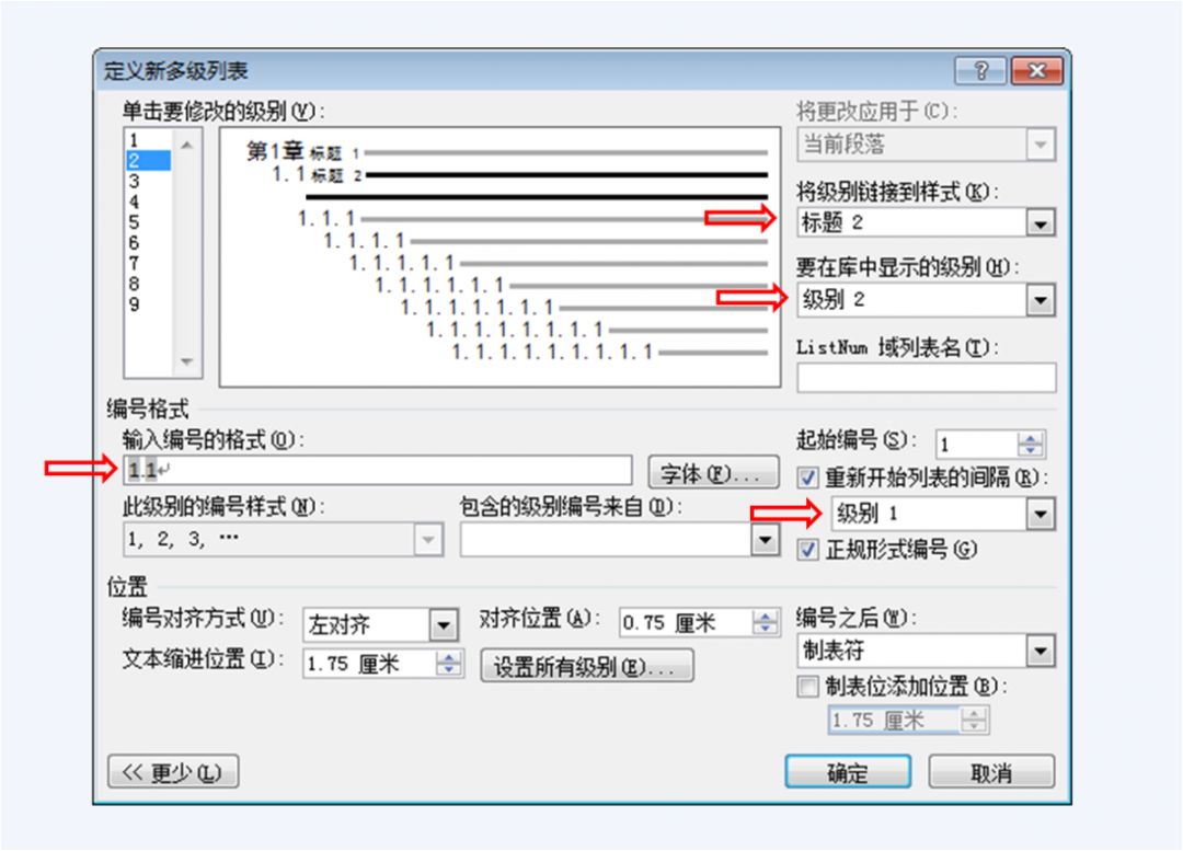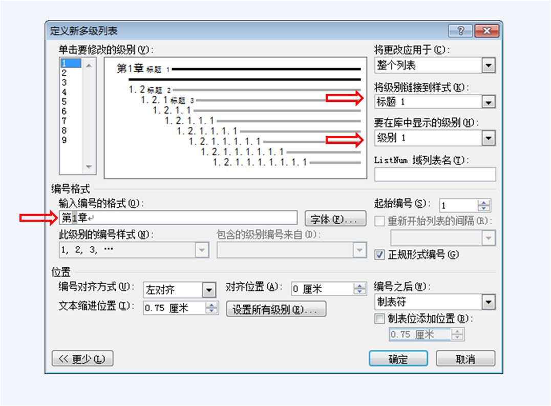 如果要定义章标题,选择“单击要修改的级别”列表中的1。如果要定义节的标题,选择列表中的2。如果要定义子节的标题,选择列表中的3。如此类推。当然,应按顺序定义章、节和子节标题(因为下一级与上一级有关联,如果不先定义上一级,那么下一级就无法关联上一级)。往下仅介绍三个级别的标题设置,即分别选择图中红圈所示的数字列表中的1、2、3的情况。