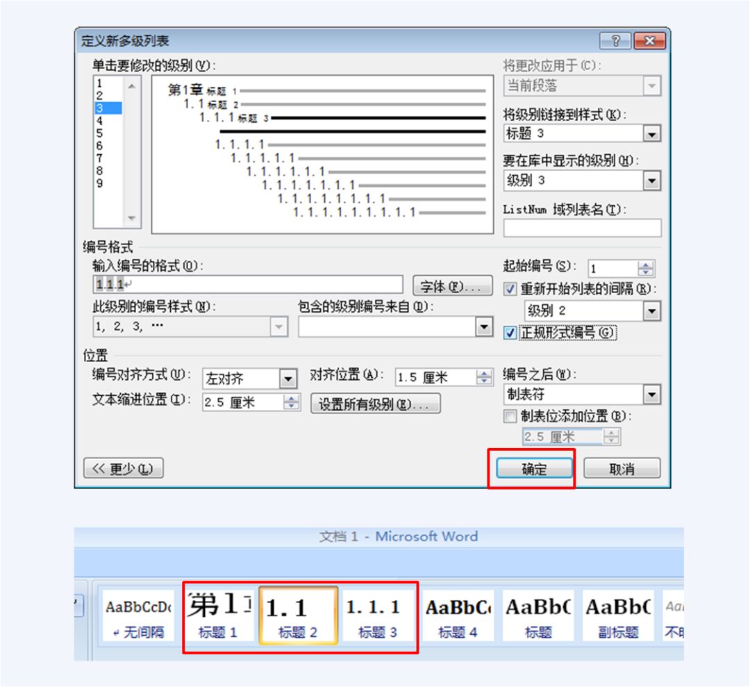 设置完全部标题后,点击如图11(上)红框所示的“确定”,那么多级列表设置就在你打开的文档中得到保存(但并不一定表明在word中得到保存,你只有打开已设置多级列表并保存的文档,这些设置才有效)。