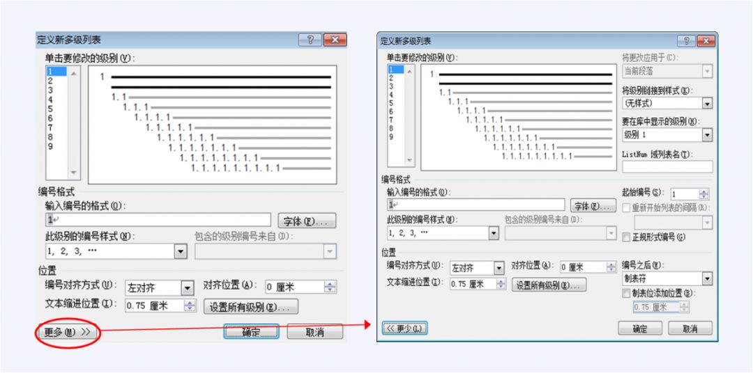 在“定义多级列表”对话框中,点击如图6左下角红圈所指的“更多”按钮,对话框将展开成图6右侧形式。现在可以用图6右侧所示的展开的多级列表对话框来设置各级标题和编号规则了。具体设置见本文第3节。