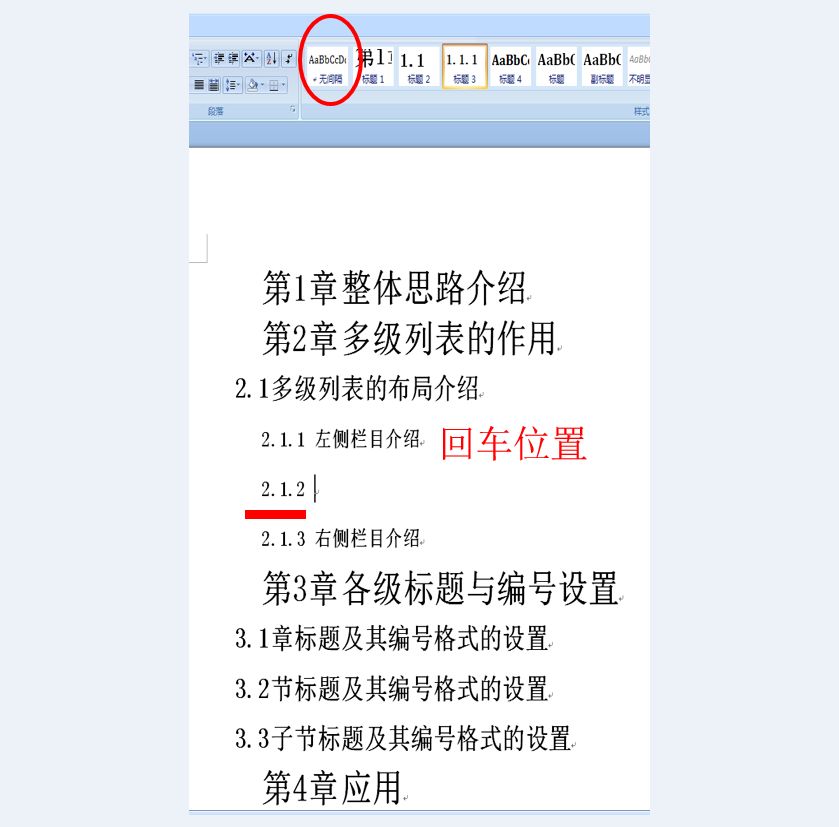 如图14所示,先从上面的标题末尾回车,此时,会新出先新的同级标题的编号。在式样库中点击红圈所指的“无间断”(位置或名称可能与word的版本有关),那么“2.1.2”节所在的位置就变成文本录入状态,你可以录入文本了。