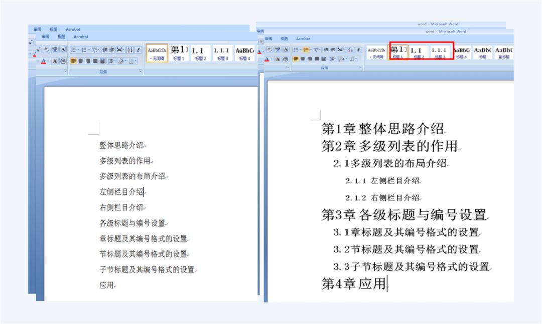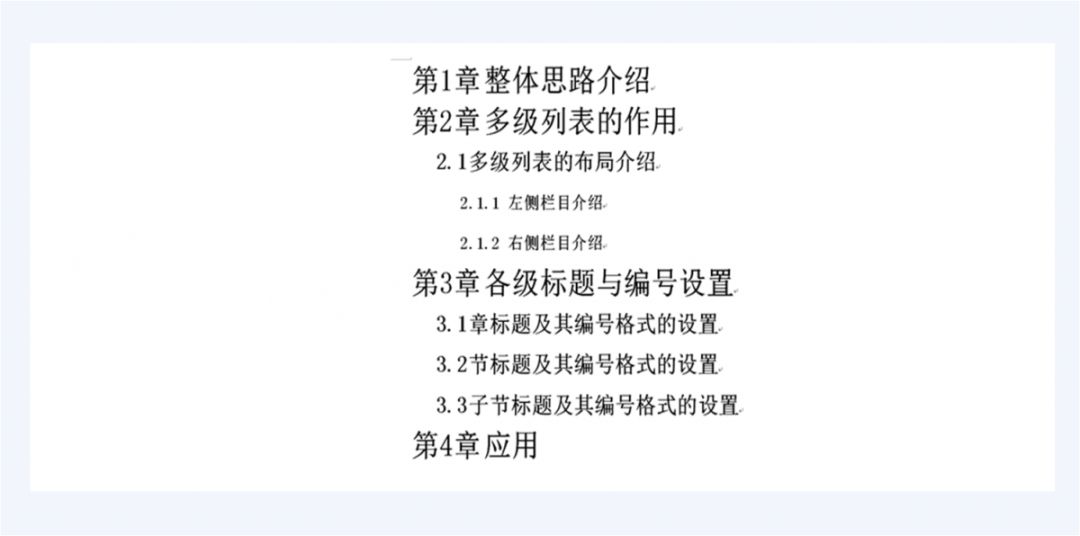 章标题设置:在word文档中某行,录入一个标题字段,如“整体思路介绍”,拾取改行所在位置,再点击样式库中的“第1章-标题1”,该标题就显示成“第1章 整体思路介绍”。如果你在这个标题之下需要给出第二章的标题,标题名为“多级列表的作用”,那么先录入“多级列表的作用”,拾取后再次点击式样库中的“第一章-标题1”,那么就出现“第2章 多级列表的作用”。对于其它章,操作方法类似。