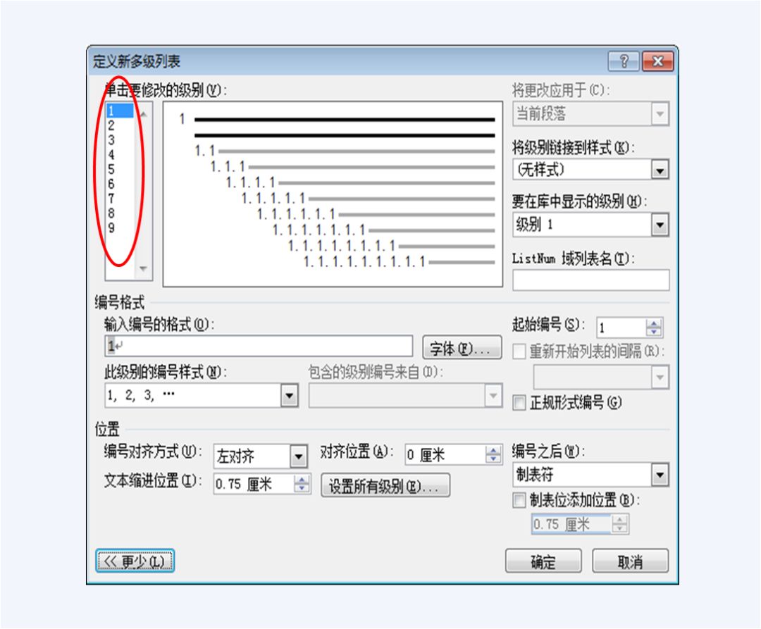 现在介绍如何使用如图7所示的已经展开的“定义多级列表”对话框。图中红圈所示的数字列表用于选择标题级别。