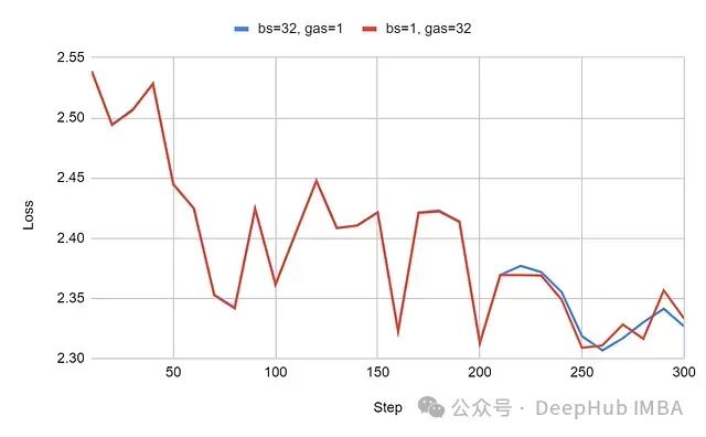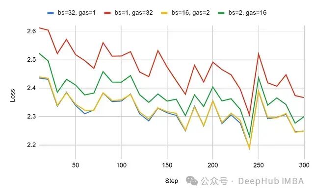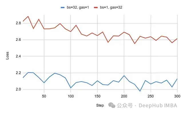 实验数据显示,批量大小(bs)为32与梯度累积步骤(gas)为32的配置间存在显著差异。当降低梯度累积步骤至16时,这种差异程度有所减小。
