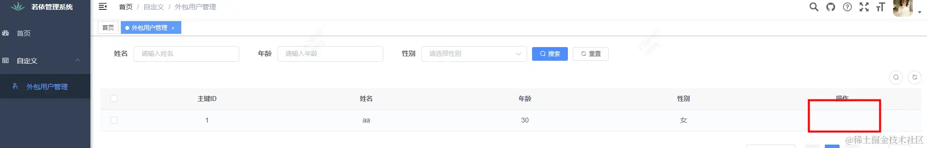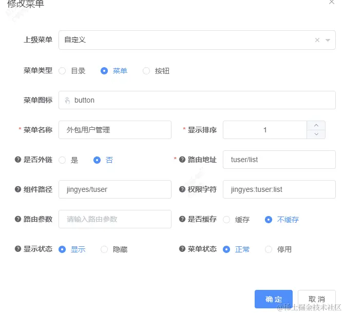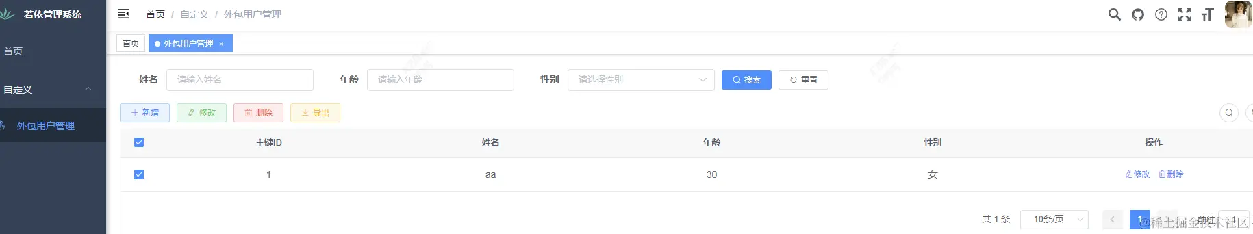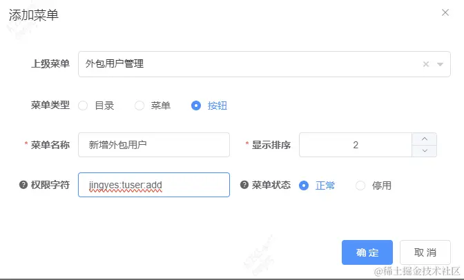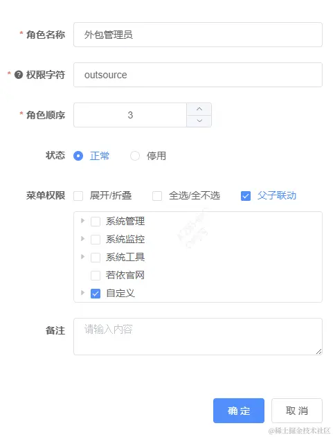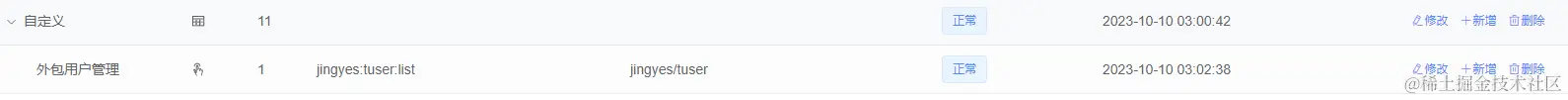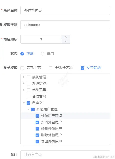 - 先新增角色 外包管理,菜单权限对应我们刚刚新加的菜单。
