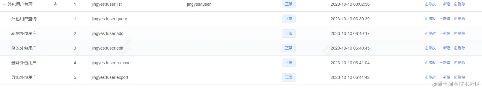 例如新增按钮,权限配置如下图所示,权限字符要和代码中对应。其他都类似