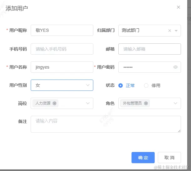 - 添加用户,角色设置为刚刚新增的 外包管理员 注意:用户名称是登录账号,用户昵称是个称呼,我一开始就搞反了。