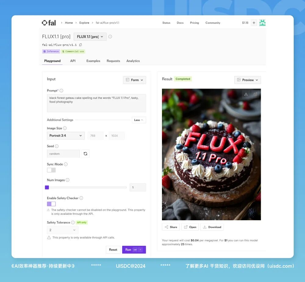 目前已经有多个平台接入了 Flux 1.1 Pro API,包括 Together.ai、Replicate、Fal.ai 和 Freepik。其中 Replicate、Fal.ai 对新用户都有免费额度,想体验新模型效果的小伙伴可以通过它们使用。