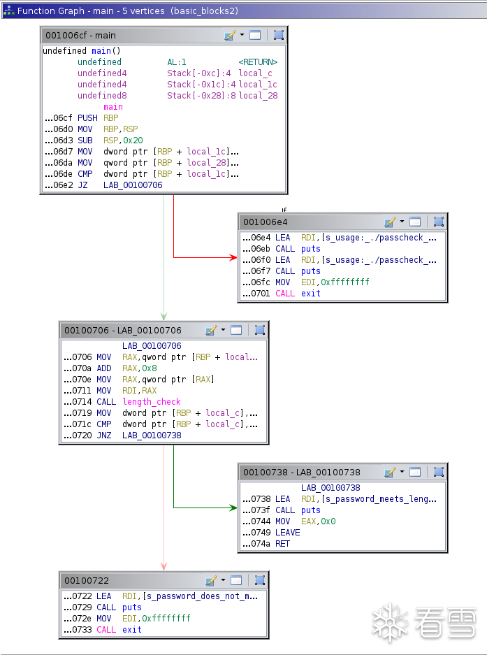 一旦我们将其编译并在Ghidra中进行分析,我们可以看到main()的以下图形视图: