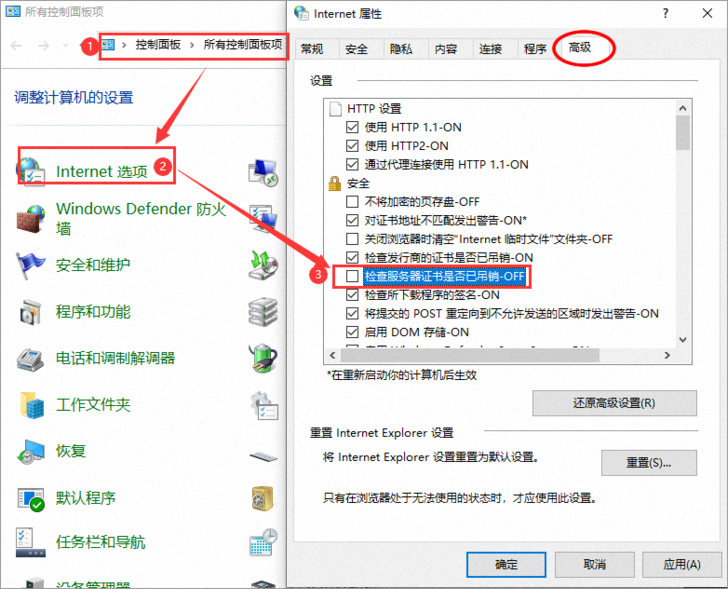 答:如果您的电脑上出现这种情况的话,可以进入控制面板中的Internet选项(也可在任意浏览器的设置菜单中进入Internet选项),在高级选项卡中,将“检查服务器证书是否已吊销”前面的勾去掉并点击确定按钮即可。