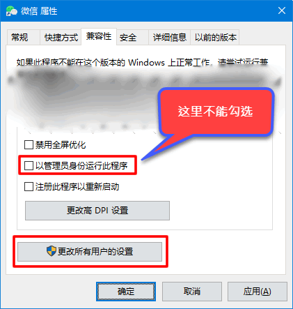 答:有三种原因会导致这种情况的发生:1,您还没有运行电脑版微信并登录您的微信号。2,运行我们软件时,360安全卫士等安全软件弹出拦截窗口后,您没有点击允许。如果是这种情况的话,您可以把360等安全软件退出后再重新运行我们软件。3,您将电脑版微信设置了“以管理员权限运行”,请以普通权限运行电脑版微信即可,可右击微信图标,再点击属性,在“兼容性”选项卡下,将“以管理员身份运行此程序”前面的勾去掉(如下图所示),如果该选项前面的勾是灰色的,无法取消勾选的话,可点击下方的“更改所有用户的设置”,再在里面取消勾选即可。另外如果不想修改微信,也可直接以管理员权限运行我们软件即可。如果按以上步骤操作后,我们软件还是不弹出“成功获取到微信号……”窗口,则请重启电脑后再试,如果问题依然存在,请重装电脑版微信软件。