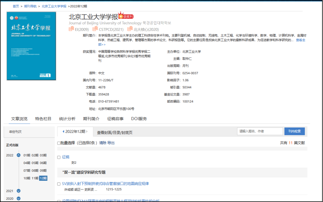 左侧为期刊的学科分类导航,中间部分为刊首字母、核心收录、收录地区、出版周期、优先出版的期刊导航。可对过创刊时间、影响因子、被引次数、更新日期排序。点击期刊,进入期刊详情页。