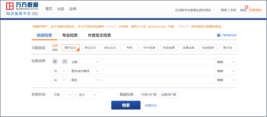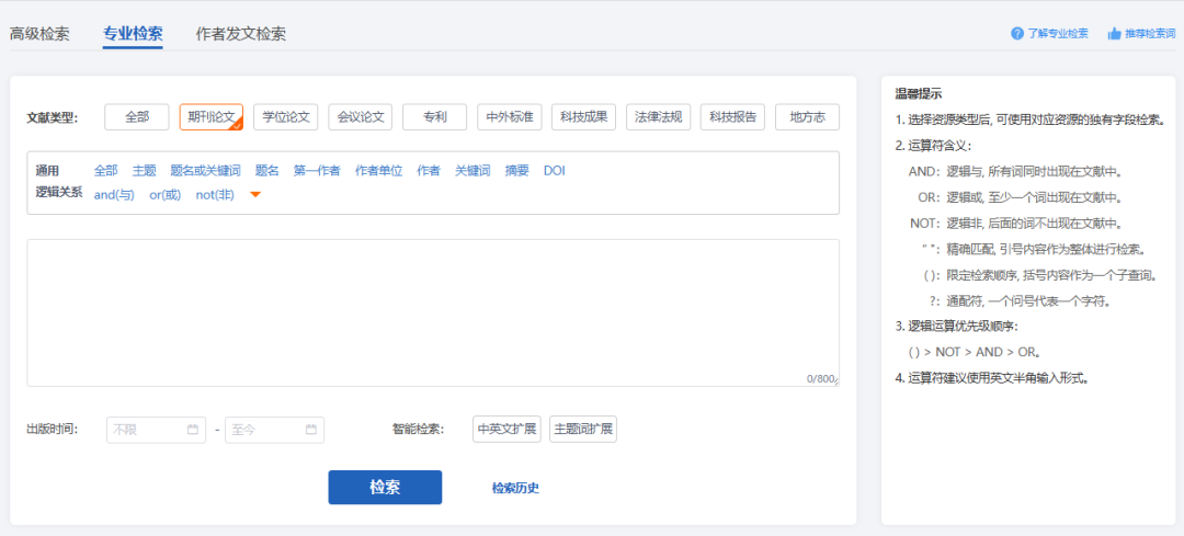 万方智搜检索框的右侧有高级检索的入口,单击进入高级检索界面。高级检索支持多个检索类型、多个检索字段和条件之间的逻辑组配检索,方便用户构建复杂检索表达式。