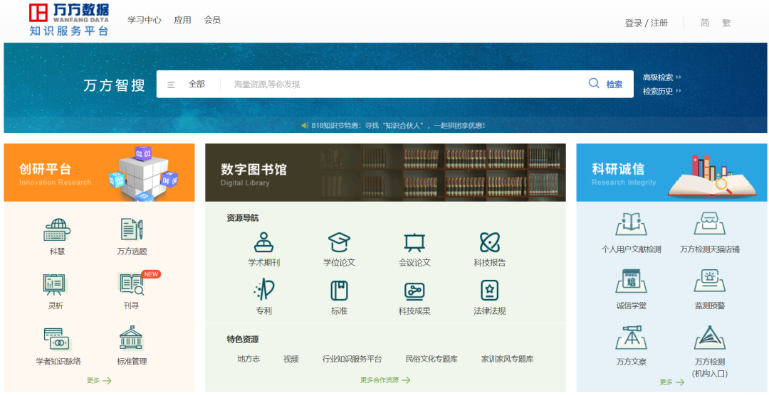 资源导航分为资源类型导航和数据库导航。从图书馆首页-资源-电子资源-数据库-中文数据库-万方数据知识服务平台即可进入。