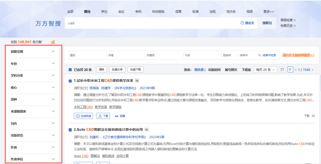 例如,期刊的检索结果页面下,可以通过出版时间、学科分类、核心收录、语种、来源数据库、刊名、出版状态、作者、机构等限定对期刊论文进行筛选。