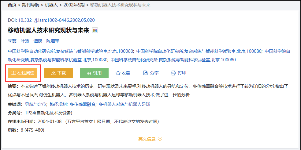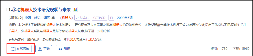 万方智搜支持全文的在线阅读,包括期刊、学位、会议、专利、科技报告、法规、地方志资源。单击检索结果页面和文献详情页面的“在线阅读”按钮可以查看文献。